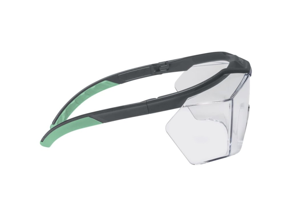Ochranné brýle vhodné pro nošení přes dioptrické brýle (OTG) s velkým plochým zorníkem, který zajišťuje maximální zorné pole a pohodlí při práci.