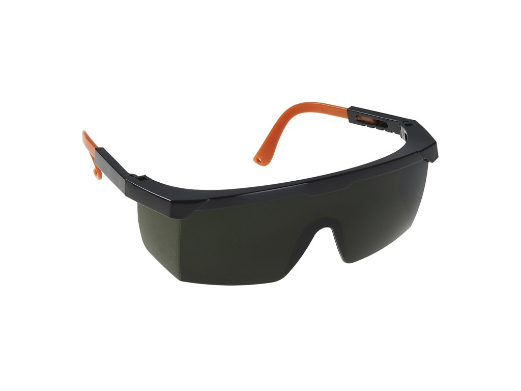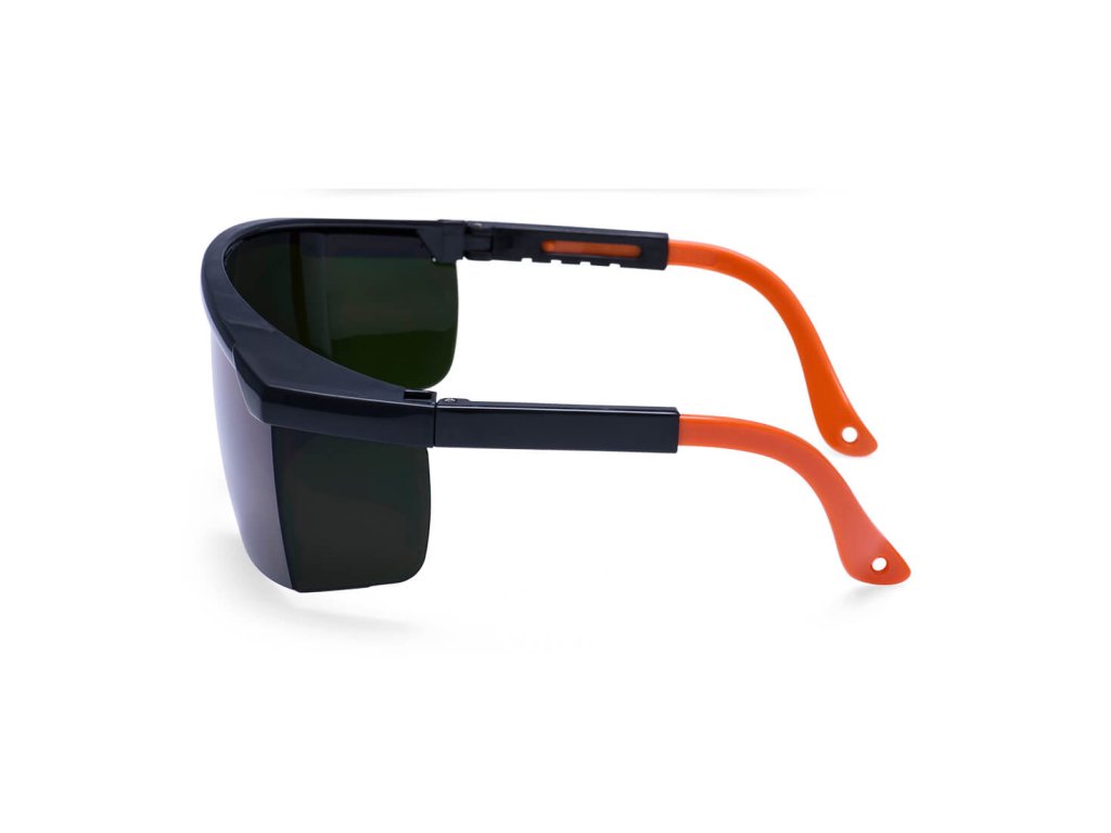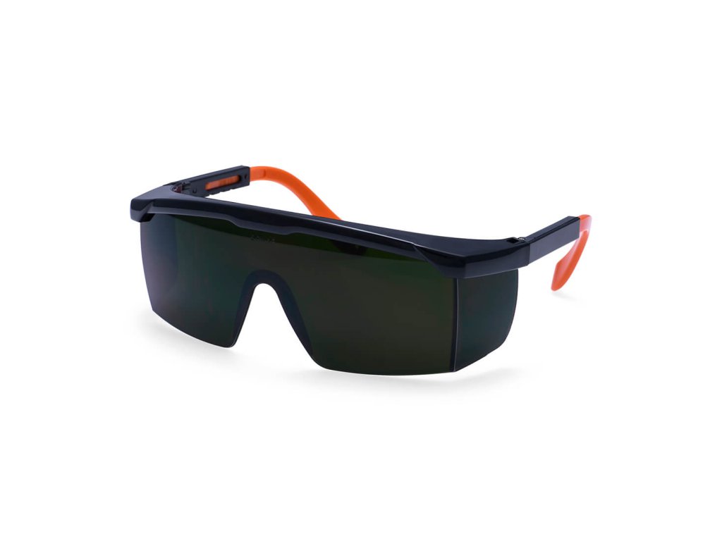 Ochranné brýle pro svářeče se stupněm ochrany 5, panoramatickým zeleným zorníkem s polykarbonátu a délkově nastavitelnými stranicemi.